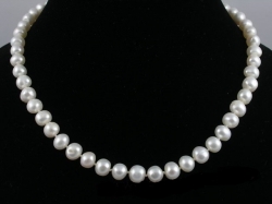 Krásný šperk je zdoben sladkovodními perlami bílé barvy o velikosti cca 8 - 9 mm. Náhrdelník je navlékán uzlíkovou metodou. Jeho délka činí přibližně 46 cm. Zakončen je praktickým magnetickým zapínáním kulatého tvaru. Šperk oceníte jak na běžné nošení tak i na slavnostnější příležitosti.